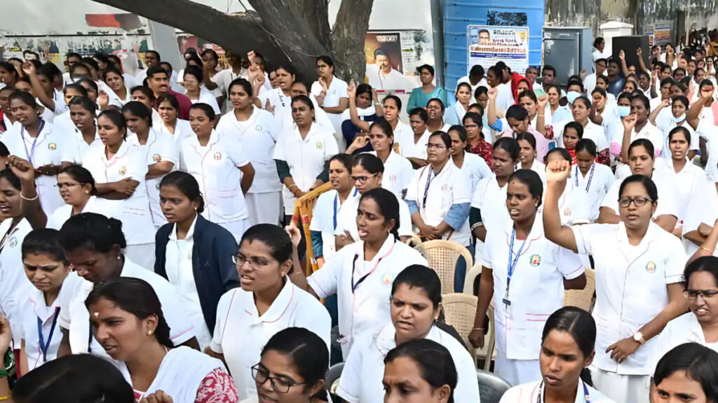 பணி நிரந்தரம், உரிய ஊதியம் உள்ளிட்ட பல்வேறு கோரிக்கைகளை முன்வைத்து தமிழ்நாடு முழுவதும் செவிலியர்கள் தொடர்ந்து போராட்டத்தில் ஈடுபட்டு வருகின்றனர். இந்த போராட்டம் மூன்றாவது நாளாக நீடித்து வரும் நிலையில், செவிலியர்கள் தங்களது கோரிக்கைகளில் இருந்து பின்வாங்க மறுத்து உறுதியுடன் களத்தில் நிற்கின்றனர்.