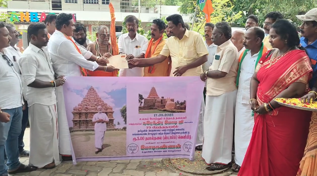 பின்னர் ஆதரவற்றோர் குழந்தைகளுக்கு பாஜகவினர் மதிய உணவினை பரிமாறினர். முன்னதாக தமிழின் பெருமையை பறைசாற்றும் வகையில் கங்கைகொண்ட சோழபுரம் வந்த பிரதமரின் நிகழ்வை முன்னிட்டு ஐந்து ரூபாய் தபால்தலையை ஸ்ரீ ஸ்ரீ பஞ்சமுக ஆஞ்சநேயர் மடத்தின் ஜீயர் ஸ்ரீமதேவாயு சித்தராமானுஜ தாச ஜீயர் சுவாமிகள் வெளியிட்டார். பின்னர் தபால்தலைக்கு மலர் தூவி பிரதமர் மோடிக்கு பிறந்தநாள் வாழ்த்து தெரிவித்து நிர்வாகிகள் அனைவரும் முழக்கங்களை எழுப்பினர்.