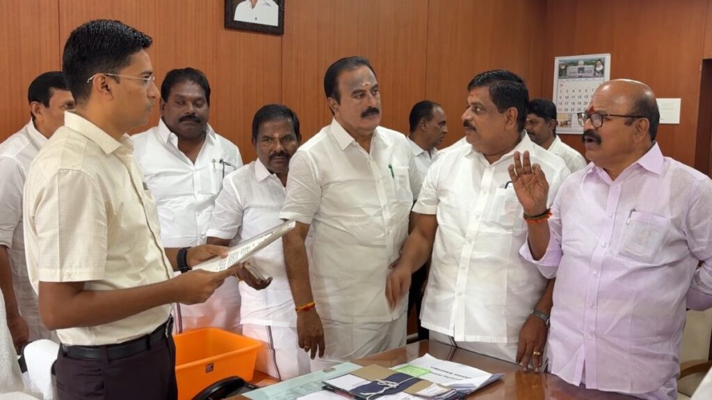 திருப்பூர் மாவட்டத்தில் நடைபெற்று வரும் சிறப்பு தீவிர வாக்காளர் பட்டியல் திருத்தப் பணிகள் (Special Summary Revision) தொடர்பாக, அதிமுக சார்பில் முன்னாள் அமைச்சர்கள் மற்றும் சட்டமன்ற உறுப்பினர்கள் இன்று (தேதி குறிப்பிடவும்) மாவட்ட ஆட்சியர் அலுவலகத்தில் ஆட்சியரிடம் மனு அளித்தனர். வாக்காளர் திருத்தப் பணிகளுக்கான பூர்த்தி செய்யப்பட்ட விண்ணப்பப் படிவங்களை, அரசியல் கட்சிகளின் பூத் ஏஜெண்டுகள் பெறுவதற்கு அனுமதி வழங்கப்பட்டிருப்பதன் மூலம் முறைகேடுகள் நடைபெற வாய்ப்புள்ளதாக அதிமுகவினர் அச்சம் தெரிவித்து, இது குறித்து உரிய நடவடிக்கை எடுக்க வலியுறுத்தினர்.