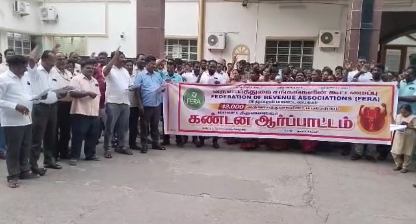 வருவாய் மற்றும் பேரிடர் மேலாண்மைதுறையில் உள்ள அனைத்து நிலையிலான காலிப்பணியிடங்களை கால முற ஊதியத்தில் நிரப்ப வேண்டும், வருவாய் துறையில் பணிபுரிபவர்களின் உயிர் உடைமைகளை பாதுகாக்கவும், தாக்குதல் நடைபெறும் பட்சத்தில் குற்றவாளிகளுக்கு கடுமையான தண்டனை வழங்கி சிறப்பு பணி பாதுகாப்பு சட்டத்தினை தமிழக அரசு உருவாக்கிட வேண்டும், வருவாய் பேரிடர் மேலாண்மை துறை நில அளவை துறையில் ஒப்பந்த தற்காலிக, தொகுப்பூதிய பணியிடங்களை கைவிட வேண்டும் என்பன 9 அம்ச கோரிக்கைகளை வலியுறுத்தி விழுப்புரம் மாவட்ட ஆட்சியர் அலுவலகம் முன்பாக வருவாய்த்துறை சங்கங்களின் கூட்டமைப்பினர் (பெரா) 100 க்கும் மேற்பட்டோர் கண்டன ஆர்ப்பாட்டத்தில் ஈடுபட்டனர். பணியை முடித்துவிட்டு தமிழக அரசுக்கு எதிராக கண்டன ஆர்ப்பாட்டத்தில் ஈடுபட்டவர்கள் தமிழக அரசுக்கு எதிராக கண்டன கோஷங்களை எழுப்பி உங்களுடன் ஸ்டாலின் திட்டத்தில் பணிச்சுமையை கலைய வாரத்திற்கு இரண்டு முறை முகாம் நடத்த வேண்டும் அதில் உடன்பாடு எட்டவில்லை என்றால் பதினைந்து நாட்கள் நீண்ட விடுப்பு எடுத்து போராட்டம் செய்ய உள்ளதாக கூறினர்.