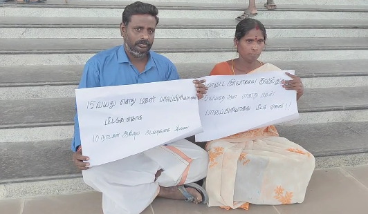 மயிலாடுதுறை மாவட்டம் குத்தாலத்தை அடுத்த திருமணஞ்சேரி கிராமத்தை சேர்ந்தவர் சுந்தரபாஸ்கர்-மகாலட்சுமி தம்பதியினர். இவரது 15 வயது மகள் அரசு பள்ளி ஒன்றில் 11-ஆம் வகுப்பு படித்து வந்தார். இவர் கடந்த 3-ஆம் பள்ளிக்குச் சென்றவர் இரவு வரை வீடு திரும்பாததால், மறுநாள் குத்தாலம் காவல் நிலையத்தில் புகார் அளித்துள்ளனர். இதுகுறித்து, போலீஸார் வழக்குப்பதிவு செய்து விசாரணை நடத்தி வருகின்றனர். இதனிடையே மயிலாடுதுறை வட்டம் மணல்மேடு காவல் நிலைய எல்லைக்கு உட்பட்ட வக்காரமாரியை சேர்ந்த கணேசன் மகன் மகேஷ் என்பவர் சிறுமியை ஆசை வார்த்தைகள் கூறி, கடத்திச் சென்றது பெற்றோருக்கு தெரியவந்துள்ளது. இதுகுறித்து, குத்தாலம் காவல் நிலையத்திலும், மயிலாடுதுறை டிஎஸ்பி அலுவலகத்திலும் தெரியப்படுத்தி ஒருவாரமாகியும் எந்த நடவடிக்கையும் எடுக்கப்படவில்லை என்பதோடு, சிறுமி குறித்து விபரம் எதுவும் அறியப்படவில்லை. இதனால், வேதனை அடைந்த பெற்றோர் மயிலாடுதுறை மாவட்ட ஆட்சியர் அலுவலகம் முன்பு கோரிக்கை விளக்க பதாகையுடன் இன்று தர்னா போராட்டத்தில் ஈடுபட்டனர். அவர்களை ஆட்சியரக அதிகாரிகள் சமரசம் செய்து மாவட்ட ஆட்சியரிடம் அழைத்துச் சென்றனர். மனுவைப் பெற்றுக்கோண்டு தகவல் கேட்டறிந்த மாவட்ட ஆட்சியர் உடனடியாக காவல் துறையினருக்கு போன் செய்து பேசி, சிறுமியை மீட்க துரித நடவடிக்கை எடுக்க உத்தரவிட்டார்.