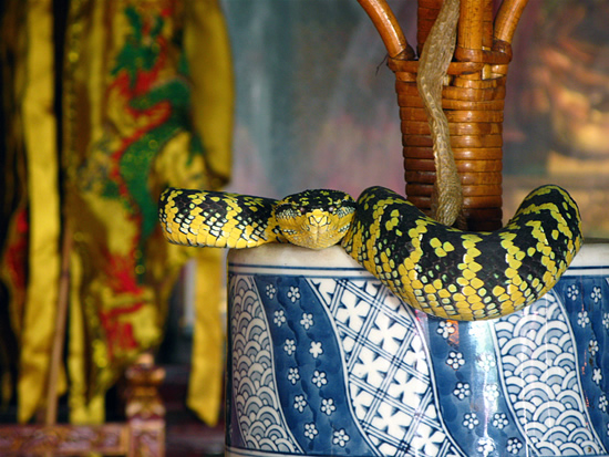 பலிபீடத்தின் முன்னும் பக்கவாட்டு அறையிலும் மூங்கில் தொப்பி நிற்பது போன்ற தோற்றத்தைச் சுற்றிலும், வாக்லர்ஸ் பிட் விப்பர்ஸ் அல்லது டெம்பிள் பிட் விப்பர்ஸ் என்று சொல்லப்படும் ஒரு டஜன் அல்லது அதற்கு மேற்பட்ட பாம்புகள் இருந்தன. மக்களின் தலைக்கு சற்று மேலே ஒரு பழைய புகைப்பட சட்டத்தின் மேல் மற்றொரு பாம்பு மூடப்பட்டிருந்தது, ஆனால் இவை உண்மையான பாம்புகள், அவை விஷம் மற்றும் அவற்றைக் கட்டுப்படுத்த கண்ணாடி அல்லது கூண்டுகள் இல்லை. தூபப் புகையால் பாம்புகளுக்கு தூக்கம் வராது, அடக்கமாக இருக்கும் என்று சிலர் கூறுகிறார்கள்.