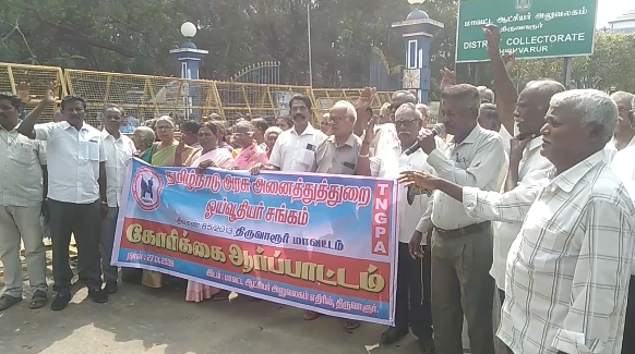 திமுக தேர்தல் நேரத்தில் கொடுத்த வாக்குறுதிகளை நிறைவேற்ற வேண்டும், 70வயது நிறைவடைந்த அனைத்து ஓய்வூதியர்களுக்கும் 10 சதவீதம் கூடுதல் ஓய்வூதியம் வழங்கிட வேண்டும், கமுட்டேஷன் திரும்ப செலுத்தும் காலத்தை 15 ஆண்டுகளில் இருந்து 11 ஆண்டுகளாக குறைத்து விட வேண்டும் உள்ளிட்ட ஐந்து அம்ச கோரிக்கைகளை நிறைவேற்ற வலியுறுத்தி திருவாரூர் மாவட்ட ஆட்சியர் அலுவலகம் முன்பு தமிழ்நாடு அரசு அனைத்துத்துறை ஓய்வூதியர் சங்கத்தினர் கோரிக்கை முழக்க ஆர்ப்பாட்டத்தில் ஈடுபட்டனர். நூற்றுக்கும் மேற்பட்ட ஓய்வூதியர்கள் கலந்து கொண்டு தங்களது கோரிக்கைகளை உடனே தமிழக அரசு நிறைவேற்ற வலியுறுத்தி கண்டன முழக்கங்களை எழுப்பினர்.