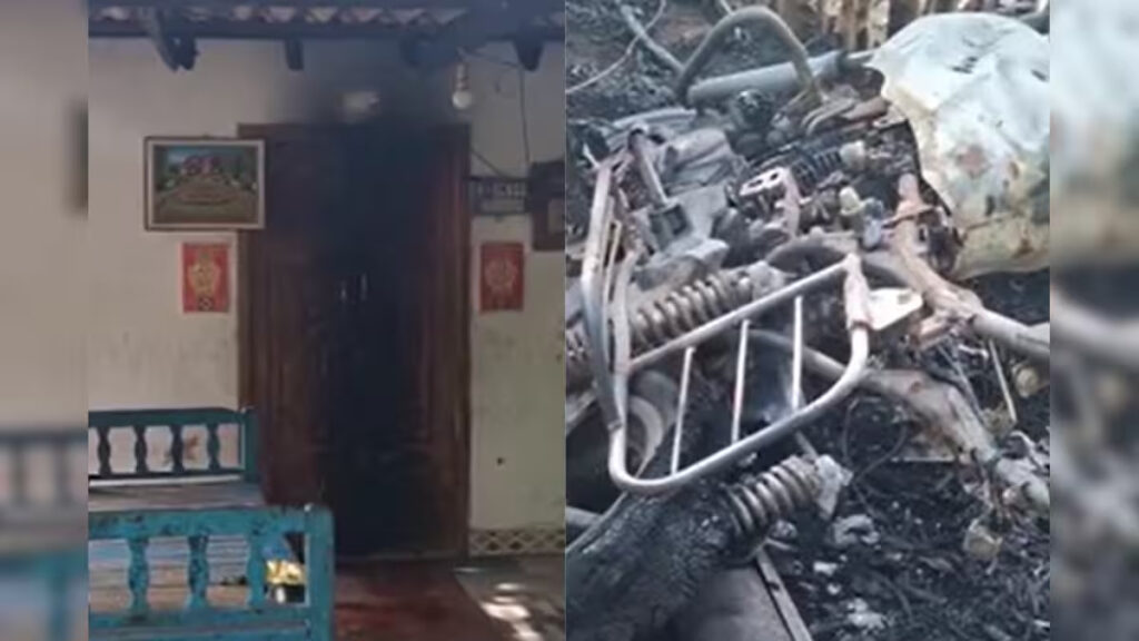 அத்துடன், வீட்டு முன்பக்க கதவும் தீக்கிரையானது. அந்த நேரத்தில் சக்திவேல், அவரது தாய், மனைவி, குழந்தைகள் வீட்டில் இருந்த நிலையில், அவர்கள் பின்பக்கமாக ஓடி உயிர் தப்பியுள்ளனர்.