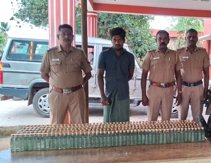 மயிலாடுதுறை மாவட்டத்தில் சட்ட விரோத மது கடத்தல் மற்றும் விற்பனையை தடுக்கும் வகையில் மாவட்ட காவல் கண்காணிப்பாளர் கோ.ஸ்டாலின் உத்தரவின்படி, மாவட்டம் முழுவதும் போலீஸார் தீவிர வாகன சோதனை மற்றும் கண்காணிப்பு பணியில் ஈடுபட்டு வருகின்றனர். அதன் ஒருபகுதியாக பெரம்பூர் காவல் சரகம், கொடவிளாகம் அருகே மயிலாடுதுறை உட்கோட்ட தனிப்படையினர் வாகன தணிக்கையில் ஈடுபட்டிருந்த போது, காரைக்கால் பகுதியில் இருந்து இருசக்கர வாகனத்தில் புதுச்சேரி சாராய பாட்டில்களை கடத்தி வந்த, பனங்குடி காலனித் தெருவை சேர்ந்த எழிலரசன் (25), என்பவரை கைது செய்தனர். அவரிடமிருந்து 400 புதுச்சேரி சாரய பாட்டில்கள், இருசக்கர வாகனம் ஆகியவற்றை பறிமுதல் செய்தனர். எழிலரசன் மீது வழக்குப்பதிவு செய்து சிறையில் அடைத்தனர்