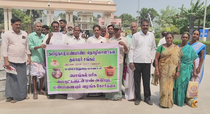 மயிலாடுதுறை மாவட்ட ஆட்சியர் அலுவலகத்தில் இன்று மாவட்ட ஆட்சியரின் மக்கள் குறை தீர்க்கும் நாள் கூட்டம் நடைபெற்றது. மாவட்ட ஆட்சியர் ஸ்ரீகாந்த் தலைமை வகித்து மாவட்டத்தின் பல்வேறு பகுதிகளில் இருந்து வந்திருந்த பொதுமக்களிடம் மனுக்களை பெற்றார். அப்போது தமிழ்நாடு மண்பாண்ட தொழிலாளர்கள் சங்கத்தின் மாவட்ட செயலாளர் குமார், மாவட்ட தலைவர் மாரிமுத்து ஆகியோர் தலைமையில் மாவட்ட ஆட்சியர் அலுவலகத்திற்கு வந்த அச்சங்கத்தினர், தைப்பொங்கல் பண்டிகையின் போது தமிழக அரசு வழங்கிடும் பொங்கல் பரிசு தொகுப்புடன் ஒரு மண் பானையும், மண் அடுப்பும் வழங்க வேண்டும். மழைக்கால பராமரிப்பு உதவித்தொகை ரூ.5,000 என உள்ளதை ரூ.10,000 ஆக உயர்த்தி வழங்க வேண்டும். மண்பாண்ட தொழிலாளர்கள் நல வாரியத்தில் இந்நாள் வரை பதிவு செய்யப்பட்ட அனைத்து தொழிலாளர்கள் குடும்பத்துக்கும் நிவாரணம் வழங்க வேண்டும் மண்பாண்ட கலை அழிந்து விடாமல் பாதுகாக்க பள்ளி புத்தகத்தில் தனி பாட பிரிவை அளிக்க வேண்டும், மாவட்டம்தோறும் தொழிற்கூடம் அமைத்து மண் பொம்மை மற்றும் மண்பாண்ட கலைகள் பற்றி பயிற்சி அளிக்க வேண்டும் என கோரிக்கை வைத்தனர்