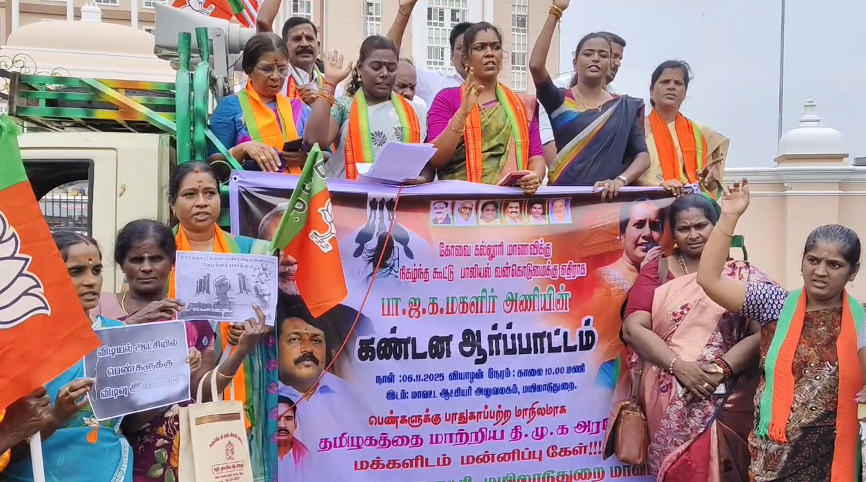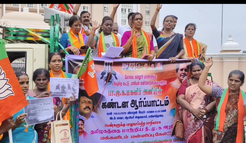 கடந்த சில தினங்களுக்கு முன்பு கோவையில் மாணவி ஒருவர் கூட்டு பாலியல் வன்கொடுமை செய்யப்பட்டார். பெண்களுக்கு எதிரான பாலியல் வன்கொடுமைகளை கண்டித்தும், பெண்களுக்கு பாதுகாப்பற்ற மாநிலமாக தமிழகத்தை மாற்றிய திமுக அரசை கண்டித்தும் பாரதிய ஜனதா கட்சியின் மகளிர் அணி சார்பில் மாவட்ட ஆட்சியர் அலுவலகம் எதிரே கண்டன ஆர்ப்பாட்டம் நடைபெற்றது. பாஜக மயிலாடுதுறை மாவட்ட மகளிர் அணி தலைவி சுதா எழில் தலைமையில் நடைபெற்ற போராட்டத்தில் ஏராளமான பெண்கள் மற்றும் பாரதிய ஜனதா கட்சி நிர்வாகிகள் தொண்டர்கள் பங்கேற்று பாலியல் வன்கொடுமையை கண்டித்தும், நடவடிக்கை எடுக்காத தமிழக அரசை கண்டித்தும் கோஷங்களை எழுப்பினர்