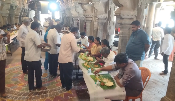 திருவாரூர் தியாகராஜா சுவாமி திருக்கோவிலில் நடைபெற்ற பொது விருந்து நிகழ்ச்சியை மாவட்ட ஆட்சியர் சட்டமன்ற உறுப்பினர் இனைந்து தொடங்கி வைத்து மக்களுடன் மக்களாக அமர்ந்து உணவருந்தினர்.