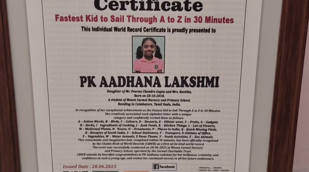 அதே பகுதியில் உள்ள தனியார் பள்ளியில் இரண்டாம் வகுப்பு பயிலும் சிறுமி ஆங்கில எழுத்துக்களில் ஏ முதல் இசட் வரையில் 26 எழுத்துக்களை முதல் எழுத்தாக கொண்ட பல்வேறு வாக்கியங்களை 18 நிமிடங்கள் 56 நொடிகளில் கூறி சோழன் உலக சாதனை புத்தகத்தில் இடம் பிடித்துள்ளார்..
