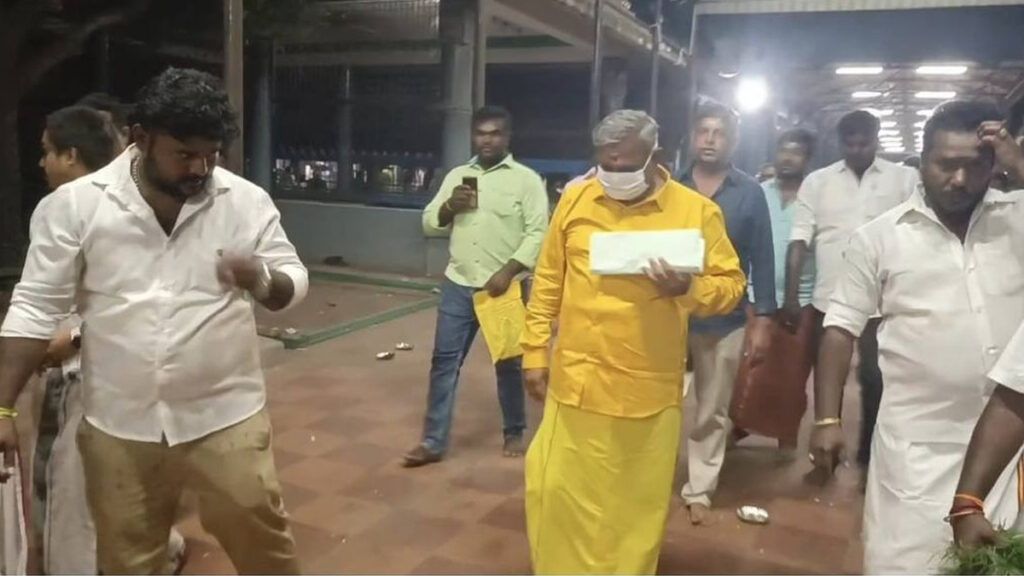 கோவிலில் ‘ஜனநாயகன்’ திரைப்படப் போஸ்டரை வைத்து சாமி தரிசனம் செய்த புஸ்ஸி ஆனந்த், உள்பிரகாரத்தை சுற்றி வந்து மருதமரம் அருகிலும், பரிவார தெய்வங்கள் மற்றும் நவகிரகங்களையும் வலம் வந்து வழிபாடு செய்தார். தொடர்ந்து 108 தேங்காய்கள் உடைத்து, படம் வெளியீட்டில் ஏற்பட்ட தடைகள் விலக வேண்டும் என வேண்டுதல் செய்தார்.
