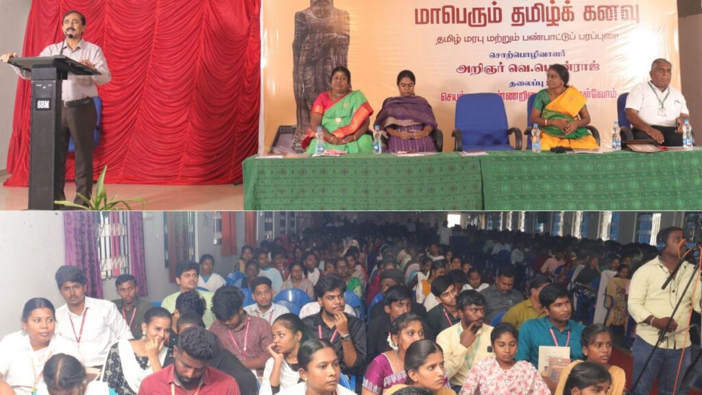 இதில் தமிழ் இலக்கிய மரபு, கலாச்சாரப் பெருமை மற்றும் உலகளாவிய தமிழ்மொழி வளர்ச்சி குறித்த பல கருத்துகள் முன்வைக்கப்பட்டன. அதனைத் தொடர்ந்து மாணவர்களுக்காக கீழடி அகழ்வாய்வு, இராஜேந்திர சோழன் வரலாறு, தமிழின் தொன்மை, மற்றும் உயர்கல்வியின் வளர்ச்சி வாய்ப்புகள் ஆகியவற்றை மையமாகக் கொண்டு உருவாக்கப்பட்ட காணொளி காட்சிகள் திரையிடப்பட்டன. இந்த நிகழ்வின் சிறப்பு அம்சமாக “செயற்கை நுண்ணறிவை எதிர்கொள்வோம்” என்ற தலைப்பில் சிறப்புரை வழங்கியவர் அறிஞர் பொன்ராஜ். அவர் உரையாற்றுகையில், “இன்றைய உலகம் செயற்கை நுண்ணறிவை (Artificial Intelligence) தவிர முடியாத நிலைக்கு வந்துள்ளது. ஆனால் அதை மனித நலனுக்காக எவ்வாறு மாற்றுவது என்பது நம் தலைமுறையின் பொறுப்பு. தமிழின் ஆற்றலும், செயற்கை நுண்ணறிவின் திறனும் இணைந்தால், நம் சமூகத்தை நவீனத்திற்கும், நன்மைக்கும் வழிநடத்தலாம்,” என்று மாணவர்களிடம் வலியுறுத்தினார்.