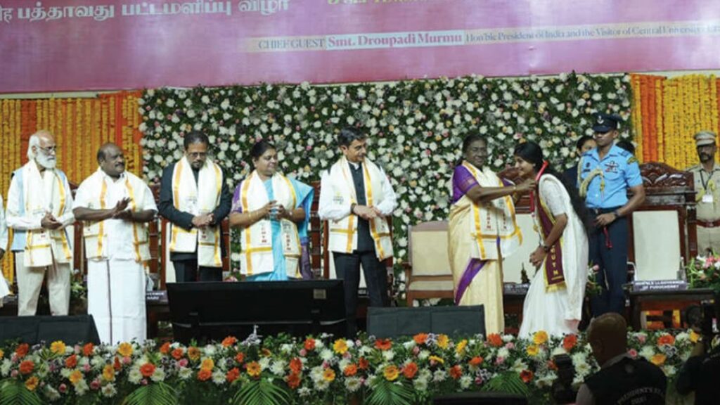 திருவாரூரில் உள்ள தமிழ்நாடு மத்திய பல்கலைக்கழகத்தின் 10வது பட்டமளிப்பு விழாவில் சிறப்பு விருந்தினராகக் கலந்து கொண்ட குடியரசுத் தலைவர் திருமதி திரௌபதி முர்மு, பின்தங்கிய மக்களின் முன்னேற்றத்திற்கு மாணவர்கள் தங்கள் திறன்களைப் பயன்படுத்தி உதவ வேண்டும் என்று வேண்டுகோள் விடுத்தார். கல்வி, சமூக வளர்ச்சிக்கு ஒரு முக்கிய கருவி என்பதை அவர் வலியுறுத்தினார்.