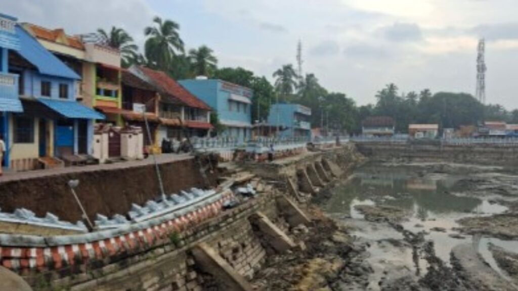 ஆனால் அதனைத் தொடர்ந்து, கடந்த வாரம் தொடங்கிய கனமழையால் குளம் நிரம்பி வழிந்தது. இதனால், மதிலின் அடிப்பகுதியில் நீர் ஊறி மண் அடர்த்தி குறைந்ததால், சுவர்கள் பலவீனமடைந்தன. இன்று காலை, குளத்தின் வடபுற மதிலின் ஒரு பகுதி இடிந்து விழுந்தது. மதில் சரிவைத் தொடர்ந்து, அப்பகுதியில் வசிக்கும் மக்கள் மற்றும் பக்தர்கள் அச்சத்துடன் இருக்கின்றனர்.
