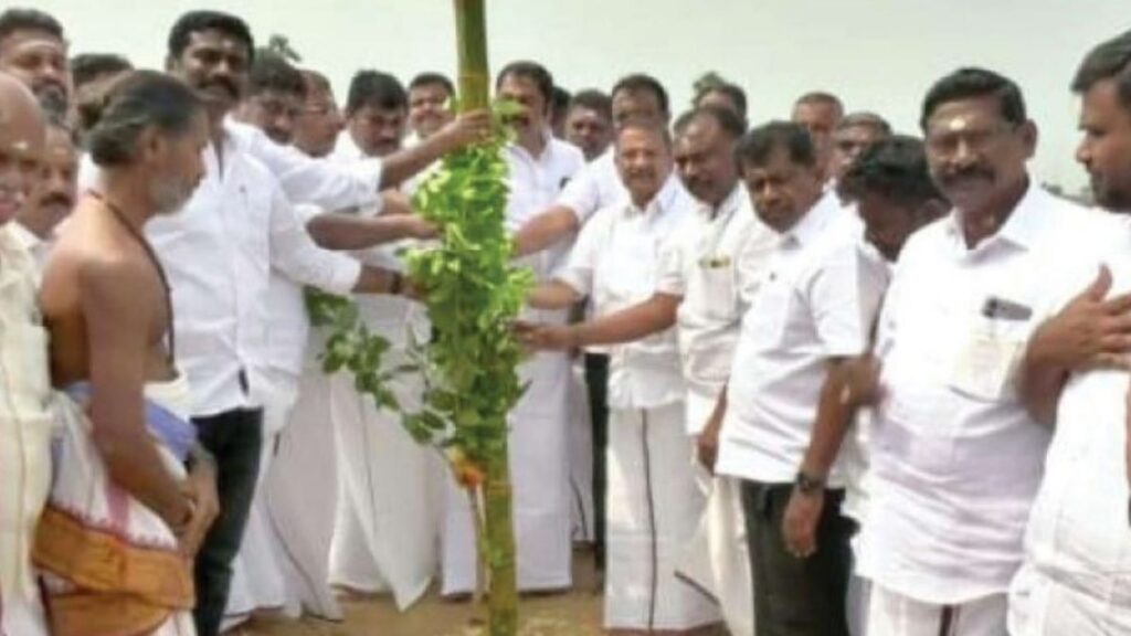 நாமக்கல் மாவட்டம் குமாரபாளையத்தில், தமிழர்களின் வீர விளையாட்டான ஜல்லிக்கட்டுப் போட்டி வரும் ஜனவரி 25-ஆம் தேதி மிக விமரிசையாக நடைபெற உள்ளது. கடந்த பத்து ஆண்டுகளாகத் தொடர்ந்து நடத்தப்பட்டு வரும் இந்த வரலாற்றுச் சிறப்புமிக்க நிகழ்வு, இந்த ஆண்டு பத்தாம் ஆண்டு நிறைவு விழாவாக (தசம ஆண்டு) கொண்டாடப்பட உள்ளது. இதற்காகக் குமாரபாளையம் எஸ்.எஸ்.எம். பொறியியல் கல்லூரிக்கு பின்புறம் உள்ள பரந்த மைதானம் தேர்வு செய்யப்பட்டுள்ளது. ஜல்லிக்கட்டுப் போட்டிக்கான வாடிவாசல் அமைத்தல், பார்வையாளர்களுக்கான கேலரி மற்றும் பாதுகாப்பு பேரிகார்டுகள் அமைக்கும் பணிகளைத் தொடங்கும் விதமாக, நேற்று மைதானத்தில் வேத மந்திரங்கள் முழங்க முகூர்த்தகால் நடும் கால்கோள் விழா கோலாகலமாக நடைபெற்றது. பாரம்பரிய முறைப்படி மஞ்சள், குங்குமம் பூசி, மலர்களால் அலங்கரிக்கப்பட்ட முகூர்த்தகாலுக்குச் சிறப்புப் பூஜைகள் செய்யப்பட்டு நரிக்குடி பகுதியில் விழா அரங்கேறியது.