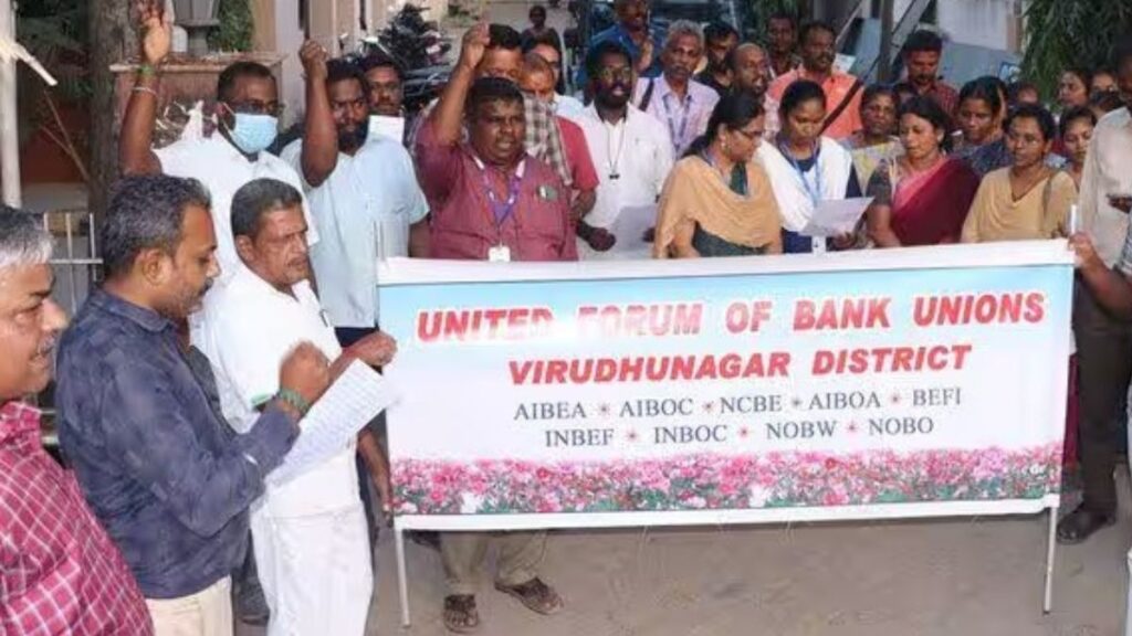 விருதுநகர் மாவட்ட பாரத ஸ்டேட் வங்கி (SBI) கிளை முன்பு, வங்கி ஊழியர் சங்கங்களின் ஐக்கிய கூட்டமைப்பு (UFBU) சார்பில், தங்களது நீண்ட கால கோரிக்கைகளை வலியுறுத்தி நேற்று எழுச்சிமிகு கவன ஈர்ப்பு ஆர்ப்பாட்டம் நடைபெற்றது. நிர்வாகி கபில்குமார் தலைமையில் நடைபெற்ற இந்த ஆர்ப்பாட்டத்தில், வங்கி ஊழியர்களின் பணிச் சூழலை மேம்படுத்தவும், குடும்ப நலனைக் கருத்தில் கொண்டும் வாரத்திற்கு ஐந்து நாட்கள் வேலை முறையை (5-Day Banking) உடனடியாக அமல்படுத்த வேண்டும் என்ற பிரதான கோரிக்கை முன்வைக்கப்பட்டது. இந்திய வங்கிகள் சங்கம் (IBA) மற்றும் மத்திய அரசுடன் எட்டப்பட்ட ஒப்பந்தங்களின்படி, அனைத்து சனிக்கிழமைகளுக்கும் விடுமுறை அளிக்கும் அரசாணையை விரைந்து வெளியிட வேண்டும் என ஊழியர்கள் வலியுறுத்தினர்.