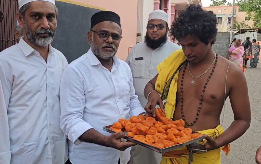 இந்நிலையில், கோவிலுக்கு அருகில் அமைந்துள்ள 300 வருடங்களுக்கு மேற்பட்ட பழமையான பள்ளிவாசல் வழியாக பக்தர்கள் ஊர்வலமாக சென்றபோது, அங்கு மாலை தொழுகையை முடித்த இஸ்லாமியர்கள் மனிதநேயத்தின் அடையாளமாக அந்த பக்தர்களுக்கு தண்ணீர் பாட்டில்கள் மற்றும் இனிப்புகள் வழங்கி வாழ்த்துகளை தெரிவித்தனர்.