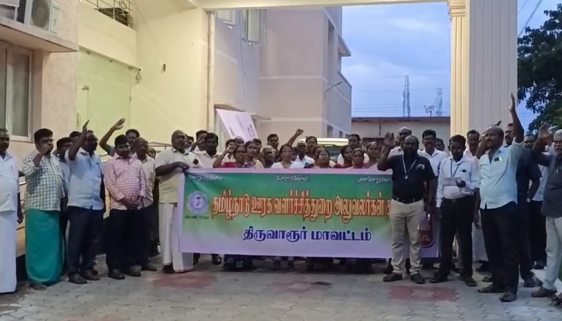 திருவாரூர் ஊரக வளர்ச்சி துறை அலுவலகத்தின் முன்பாக ஊரக வளர்ச்சி துறை அலுவலர்கள் சங்கத்தினர் ஆர்ப்பாட்டத்தில் ஈடுபட்டனர்..