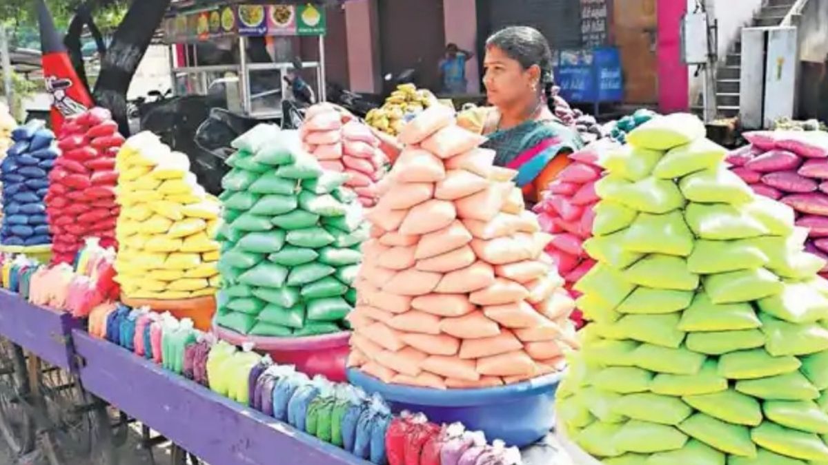 இல்லத்தரசிகளின் இந்தக் கலை ஆர்வத்தைப் பூர்த்தி செய்யும் வகையில், உடுமலை சந்தை ரோடு மற்றும் கடைவீதிப் பகுதிகளில் வண்ணக் கோலப்பொடிகளின் விற்பனை தற்போது சூடுபிடித்துள்ளது. அதிகாலையில் போடும் கோலங்கள் பளிச்சென்று தெரிவதற்காகவும், கலைநயத்துடன் மிளிர்வதற்காகவும் பெண்கள் பல வண்ணப் பொடிகளை விரும்பி வாங்குகின்றனர். சந்தையில் சிவப்பு, மஞ்சள், பச்சை, நீலம், ஆரஞ்சு, ஊதா என வானவில்லின் வண்ணங்களில் கோலப்பொடிகள் விற்பனைக்குக் குவிக்கப்பட்டுள்ளன. தரத்தைப் பொறுத்து ஒரு பாக்கெட் கோலப்பொடி 10 ரூபாய் முதல் 30 ரூபாய் வரை விற்பனை செய்யப்படுகிறது. இது தவிர, கோலம் போடுவதை எளிதாக்கும் வகையில் பல்வேறு டிசைன்கள் கொண்ட அச்சுக்களும் விற்பனைக்கு வந்துள்ளன.