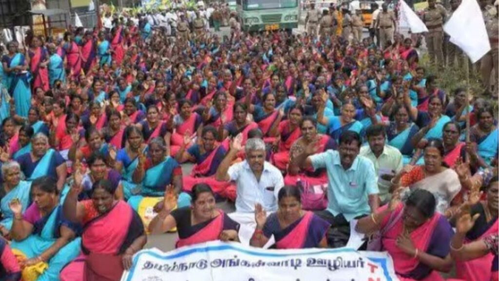 தேனி மாவட்ட ஆட்சியர் அலுவலகம் முன்பாக இன்று சி.ஐ.டி.யு., அங்கன்வாடி ஊழியர்கள் மற்றும் உதவியாளர்கள் சங்கம் சார்பில் கோரிக்கைகளை வலியுறுத்தி நடைபெற்ற அதிரடி சாலை மறியல் போராட்டத்தால் பெரும் பரபரப்பு ஏற்பட்டது. அங்கன்வாடி பணியாளர்களைப் பணி வரன்முறை செய்து அரசு ஊழியர்களாக அறிவிக்க வேண்டும், நீண்டகாலமாக நிலுவையில் உள்ள காலிப் பணியிடங்களை உடனடியாக நிரப்ப வேண்டும் மற்றும் தேர்தல் பணிகளான பி.எல்.ஓ., (BLO) பணிகளில் இருந்து தங்களை முழுமையாக விடுவிக்க வேண்டும் உள்ளிட்ட பல்வேறு கோரிக்கைகளை முன்வைத்து இந்தப் போராட்டம் முன்னெடுக்கப்பட்டது. மாவட்டத் தலைவர் சாந்தியம்மாள் தலைமையில் நடைபெற்ற இந்த மறியலில், மாநிலத் துணைச் செயலாளர் நாகலட்சுமி, மாவட்ட நிர்வாகிகள் வளர்மதி, நாகலட்சுமி மற்றும் சி.ஐ.டி.யு., மாவட்டத் தலைவர் ஜெயபாண்டி உள்ளிட்ட முக்கிய நிர்வாகிகள் முன்னிலை வகித்தனர்.