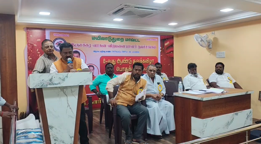 மயிலாடுதுறை மாவட்டம் மயிலாடுதுறையில் இருசக்கர வாகன விற்பனையாளர் நலச்சங்கத்தின் எட்டாம் ஆண்டு துவக்க விழா மற்றும் பொதுக்குழு கூட்டம் இன்று நடைபெற்றது. மாவட்ட தலைவர் டேவிட் தலைமையில் நடைபெற்ற இந்த பொதுக்குழு கூட்டத்தில் மாநில, மாவட்ட முக்கிய நிர்வாகிகள் பல கலந்து கொண்டு முக்கிய தீர்மானங்களை நிறைவேற்றினர்.