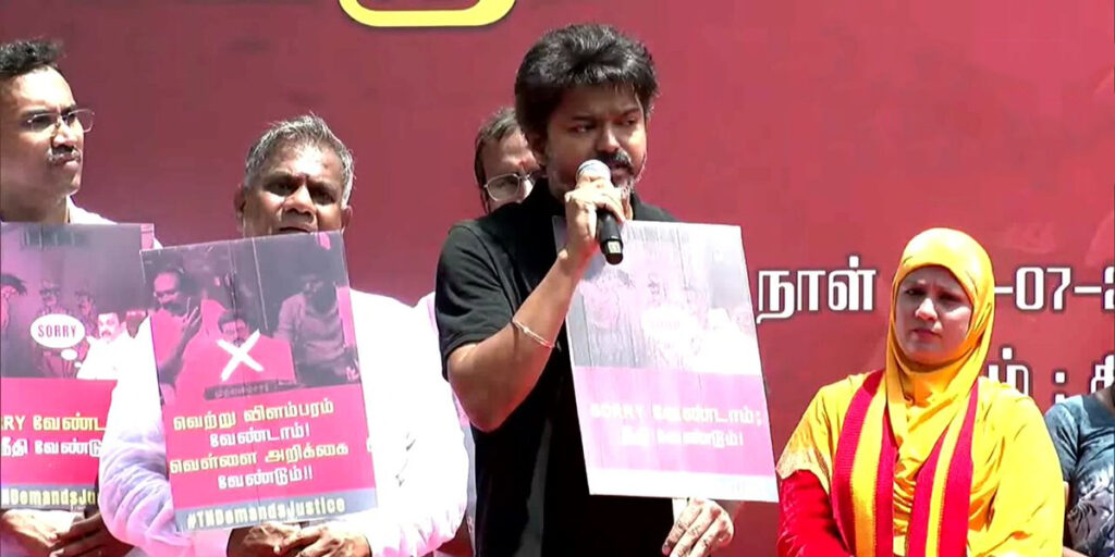 “சாரி வேண்டாம்.. நீதி வேண்டும்” என்ற வாசகத்துடன் கருப்பு உடையில் மேடையில் நின்ற விஜய், தனது கண்டன உரையால் கவனம் ஈர்த்தார். கூட்டம் அதிகமானதால், தொண்டர்கள் தடுக்கப்பட்ட பகுதிகளில் கம்பிகளை மீறி முன்னேற முயன்றபோது, சில தடுப்பு கம்பிகள் சாய்ந்தும், சேதமடைந்தும் இருந்தது.