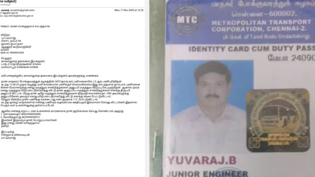 யுவராஜ், தாம்பரம் பணிமனையில் பணியாற்றி வந்தவர். கழுத்து வலி காரணமாக கடந்த ஆகஸ்ட் 12ஆம் தேதி முதல் மருத்துவ விடுப்பு கோரியிருந்ததாக தெரிவிக்கப்படுகிறது. ஆனால் அவரது விடுப்பை மேலதிகாரிகள் ஏற்காததோடு, மூன்று மாதங்களாக ஊதியம் வழங்கப்படவில்லை என்றும் கூறப்படுகிறது. இதனால் அவர் கடும் மன உளைச்சலில் இருந்ததாக தகவல்கள் வெளியாகியுள்ளன.
