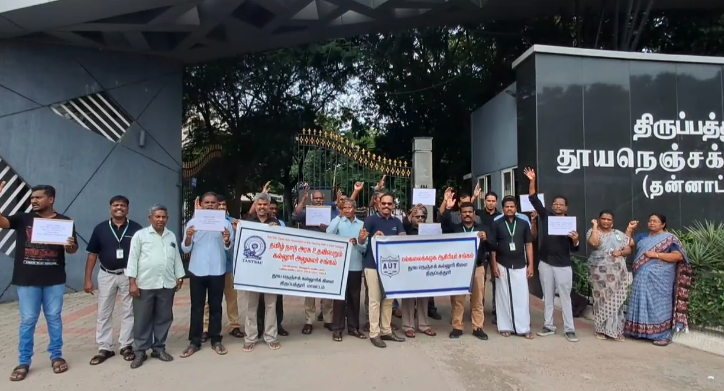 திருப்பத்தூர் மாவட்டம் திருப்பத்தூர் தனியார் கல்லூரி வாசல் முன்பு பல்கலைக்கழக ஆசிரியர் சங்கத்தைச் (AUT) சார்ந்த பேராசிரியர்கள் தமிழக அரசு சட்டசபையில் நிறைவேற்றிய தனியார் பல்கலைக்கழக திருத்த சட்ட மசோதாவிற்கு எதிர்ப்பு தெரிவித்து இன்று மூன்றாவது நாளாக கருப்பு சட்டை அணிந்து கையில் தமிழக அரசுக்கு எதிர்ப்பை தெரிவிக்கும் பதாகைகளோடு கோஷங்கள் எழுப்பி முழக்கப் போராட்டத்தை முன்னெடுத்துள்ளனர்.