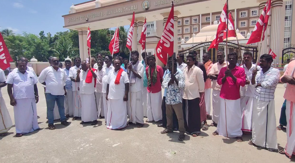 மயிலாடுதுறை மாவட்ட ஆட்சியர் அலுவலகம் முன்பு ஏஐடியுசி தொழிற்சங்கத்துடன் இணைந்த தமிழ்நாடு நுகர்பொருள் வாணிபக் கழக சுமைதூக்கும் தொழிலாளர்கள் சங்கத்தினர் கண்டன ஆர்ப்பாட்டம் நடத்தினர். மயிலாடுதுறை மாவட்டம் சீர்காழி தாலுகாவில் உள்ள எடமணல் கிடங்கில் கிடங்கு எண் 1 மற்றும் 2-ல் சுமை தூக்கும் பணியை தனியாருக்கு ஒப்பந்தம் செய்துள்ளதை கைவிட வலியுறுத்தி இந்த ஆர்ப்பாட்டம் நடைபெற்றது. இந்த ஆர்ப்பாட்டத்தில் இந்திய கம்யூனிஸ்ட் கட்சியின் மாவட்ட செயலாளர் சீனிவாசன், ஏஐடியூசி சங்கத்தின் மாவட்ட செயலாளர் ராமன், மாவட்ட தலைவர் ராஜ்மோகன் மற்றும் சுமை தூக்கும் தொழிலாளர்கள் நூற்றுக்கு மேற்பட்டோர் கலந்து கொண்டு கோரிக்கையை நிறைவேற்ற வலியுறுத்தி கண்டன முழக்கங்களை எழுப்பினர்.