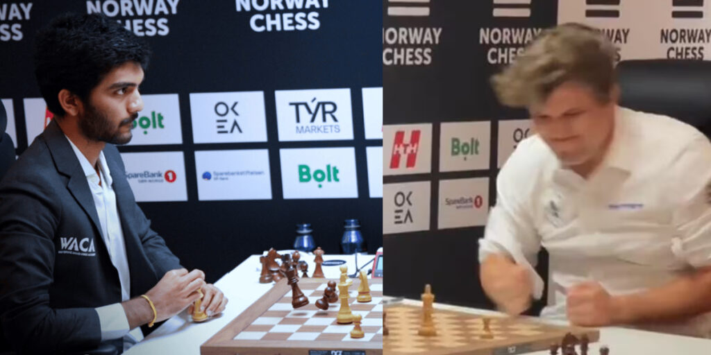 கடைசியில் போட்டியின் திசை மாறி, குகேஷ் அபார வெற்றி பெற்று கார்ல்சனுக்கு அதிர்ச்சி அளித்தார். நம்ப முடியாத அந்த வெற்றியால் குகேஷ் இருக்கையில் இருந்து எழுந்து இரு கைகளை உற்சாகமாக ஆட்டி மகிழ்ச்சியை வெளிப்படுத்தினார்.